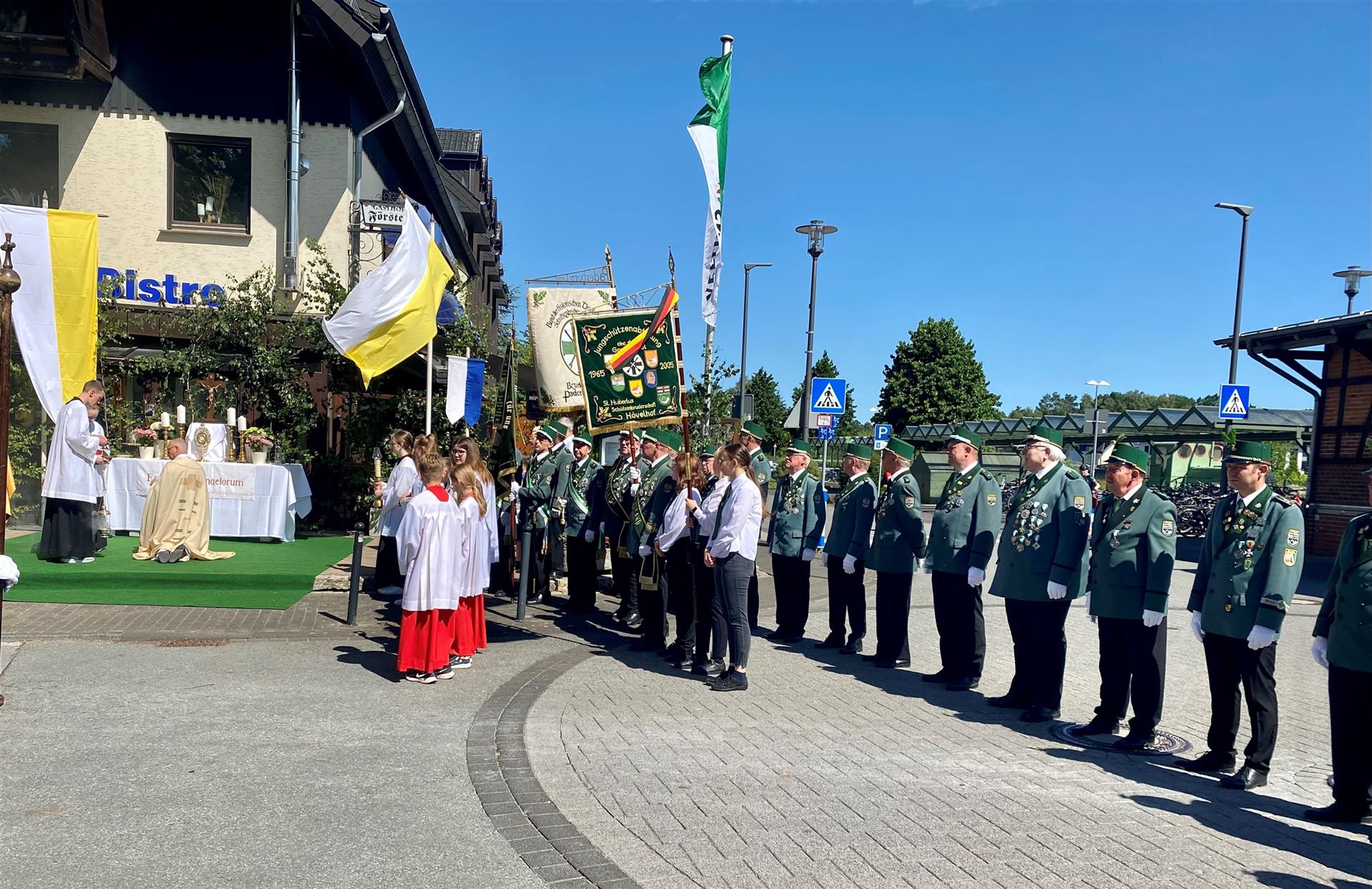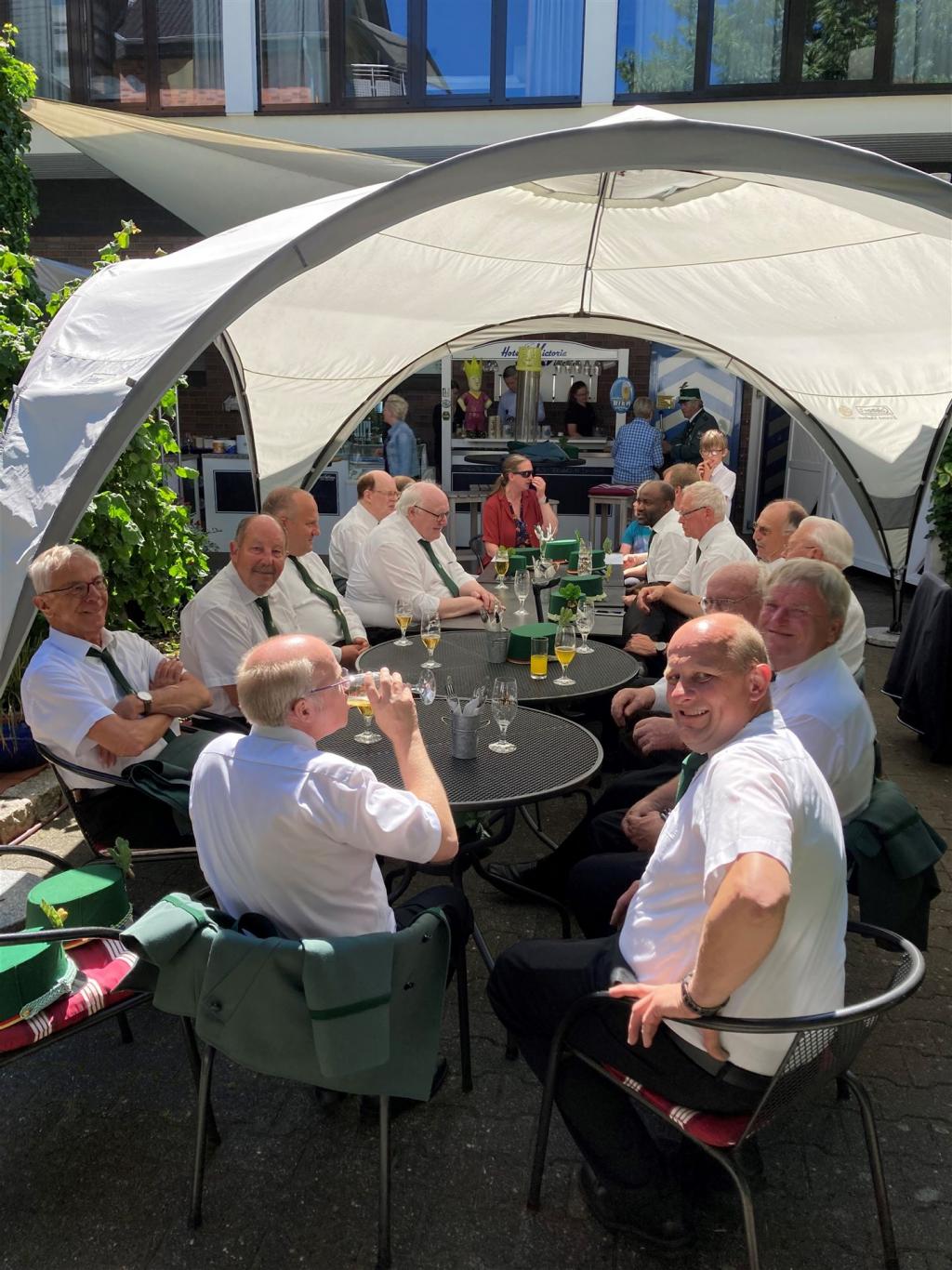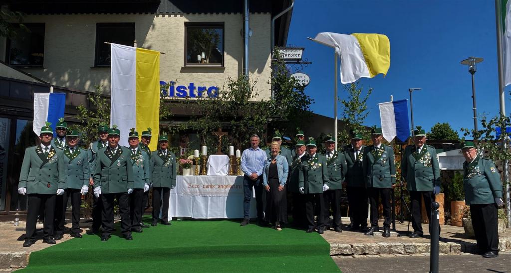 Am 16.06.2022 fand nach 4-jähriger Unterbrechung erstmals wieder die Prozession zu Fronleichnam an der Segensstation Förster statt. Unter der Leitung unseres stellvertretenden Zugführers Marc Wiethoff beteiligten sich 17 Schützen des Zuges an den erforderlichen Vor- und Nachbereitungen. Im Anschluss trafen sich alle Helfer im wunderschönen Biergarten unserer Gastgeber Victoria und Nico Förster-Streblau zu Kaltgetränken und geselligen Gesprächen. Unser Kompaniechef, Hptm Ralf Meiwes, bedankte sich bei allen Beteiligten für die hervorragende Organisation der Segensstation.
